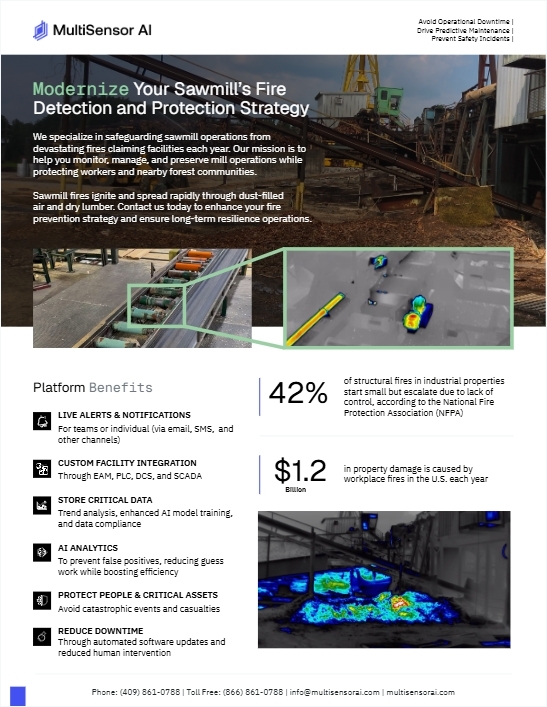 This one-pager outlines how MultiSensor AI helps sawmills prevent catastrophic fires, reduce downtime, and improve safety through continuous early fire detection. Using fixed ...