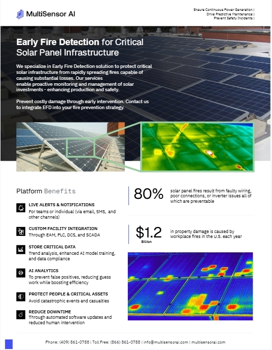 This one-pager outlines how MultiSensor AI helps solar operators prevent fires and protect energy production through continuous early fire detection. Using fixed thermal cameras ...