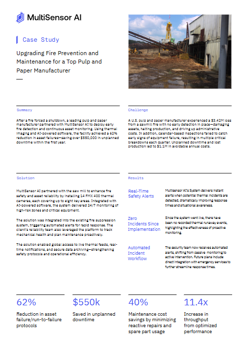 This case study shows how a leading U.S. pulp and paper manufacturer used MultiSensor AI to prevent fires and reduce unplanned downtime in a high-risk sawmill environment. After a ...