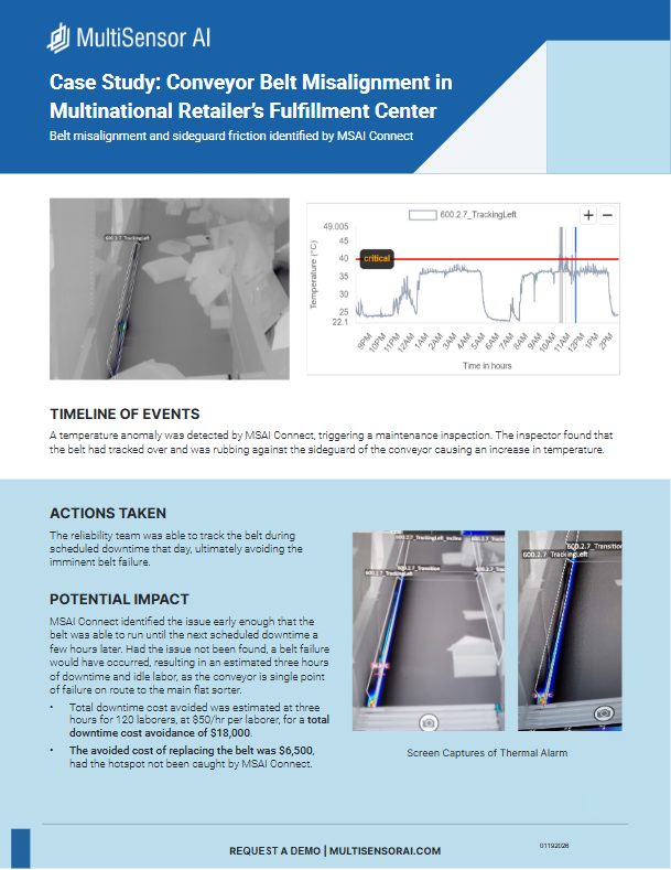 This case study shows how MultiSensor AI identified conveyor belt misalignment and sideguard friction in a multinational retailer’s fulfillment center before it caused a ...